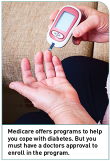Medicare offers coverage for diabetes in different ways, depending on your need. According to the “Medicare and You” handbook, Medicare covers outpatient diabetes self-management training to teach you how to cope with and manage your diabetes. The program may include tips for eating healthy, being active, monitoring blood sugar, taking medication, and reducing risks. You must have diabetes and a written order from your doctor or other health care provider to receive this training. You pay 20% of the Medicare-approved amount, and the Part B deductible applies.