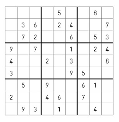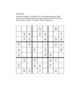 Directions: Using the numbers 1 through 9, fill in the empty spaces of a 9X9 grid in such a way that every row, every column and every 3X3 box contains the numbers 1 through 9 without repeating.
